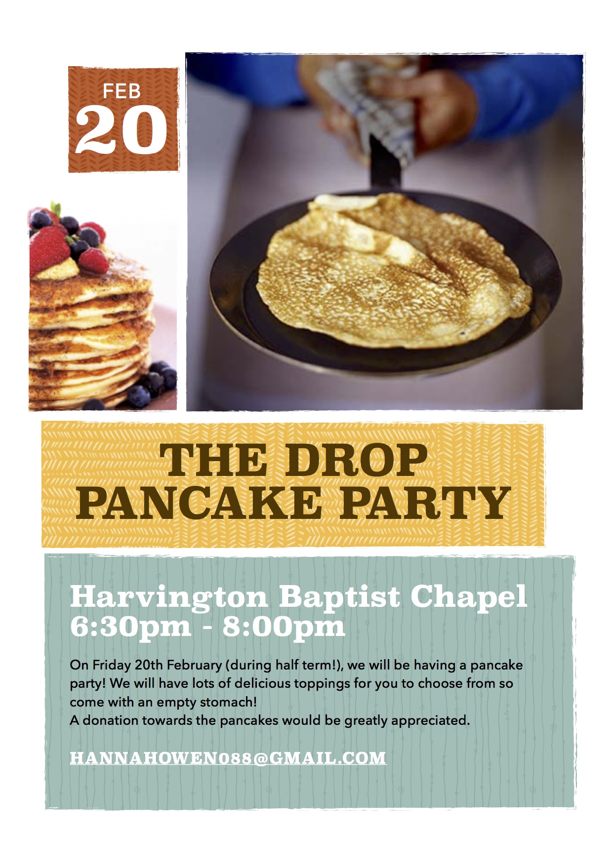 If you’re 7-13yrs old, come to the Baptist Chapel tonight – 6:30-8pm and fill up on delicious pancakes!