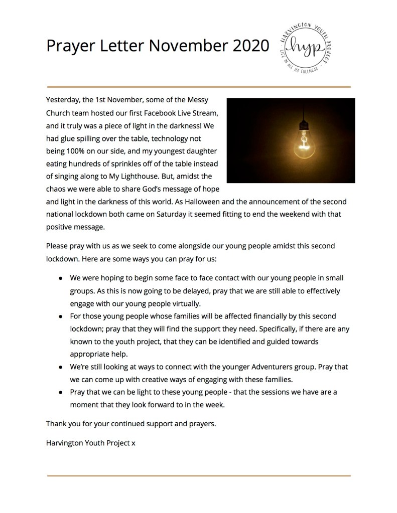 Prayer Letter November 2020 Posted byharvingtonyouthproject2 November 2020Posted inUncategorized Below is the November edition of our prayer letter. All prayers, big and small, are appreciated! Share this: Click to share on X (Opens in new window) X Click to share on Facebook (Opens in new window) Facebook Like Loading... Related