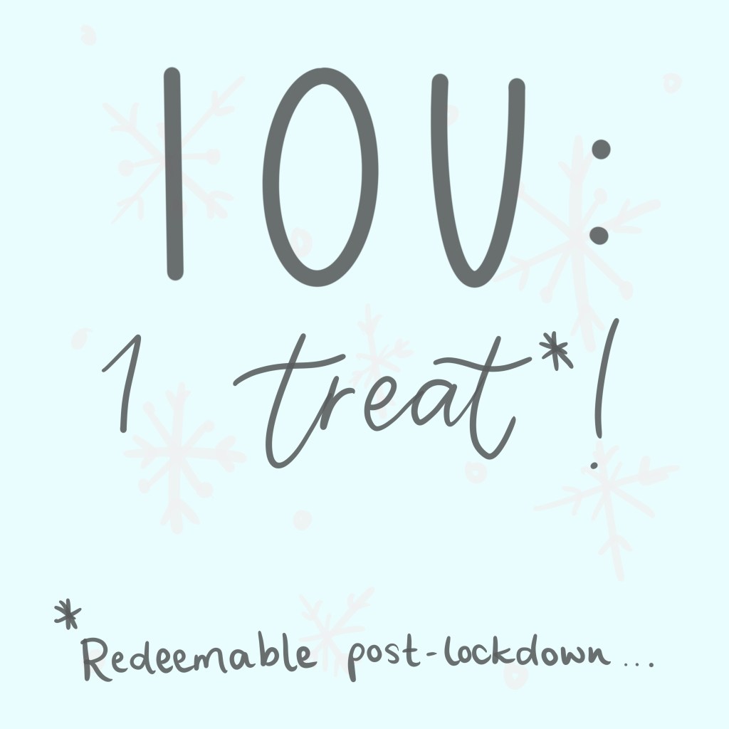 That’s why todays challenge comes in the form of a promise, or an I.O.U. Think of someone who you would like to treat, perhaps someone you haven’t been able to see over the past few months. When you have that person in mind, think of what you could do to treat them when life, perhaps, returns to ‘normal.’ When you have the person AND treat in mind, it’s time to write! Make them an I.O.U. card which says what you’re going to treat them with!